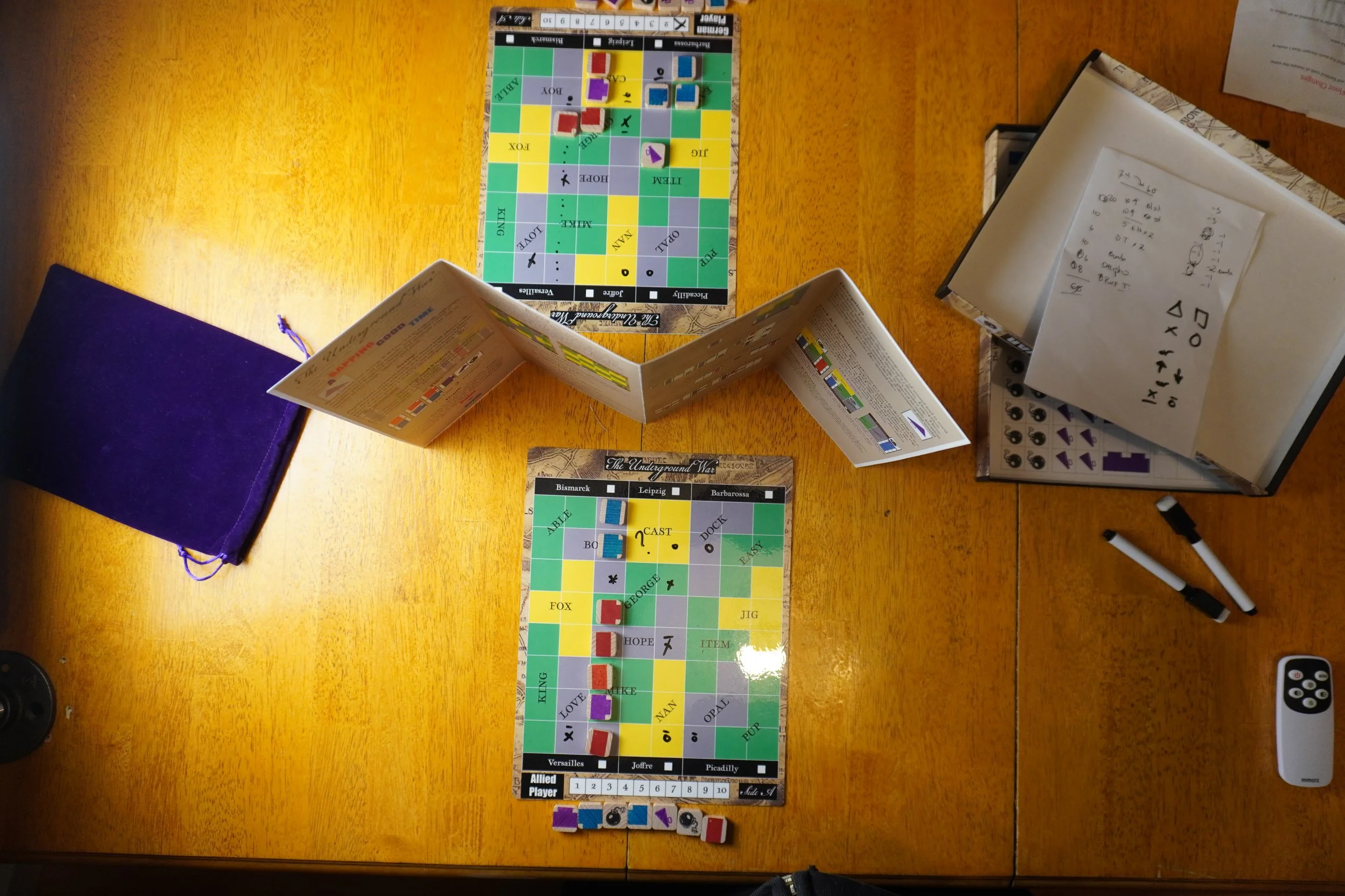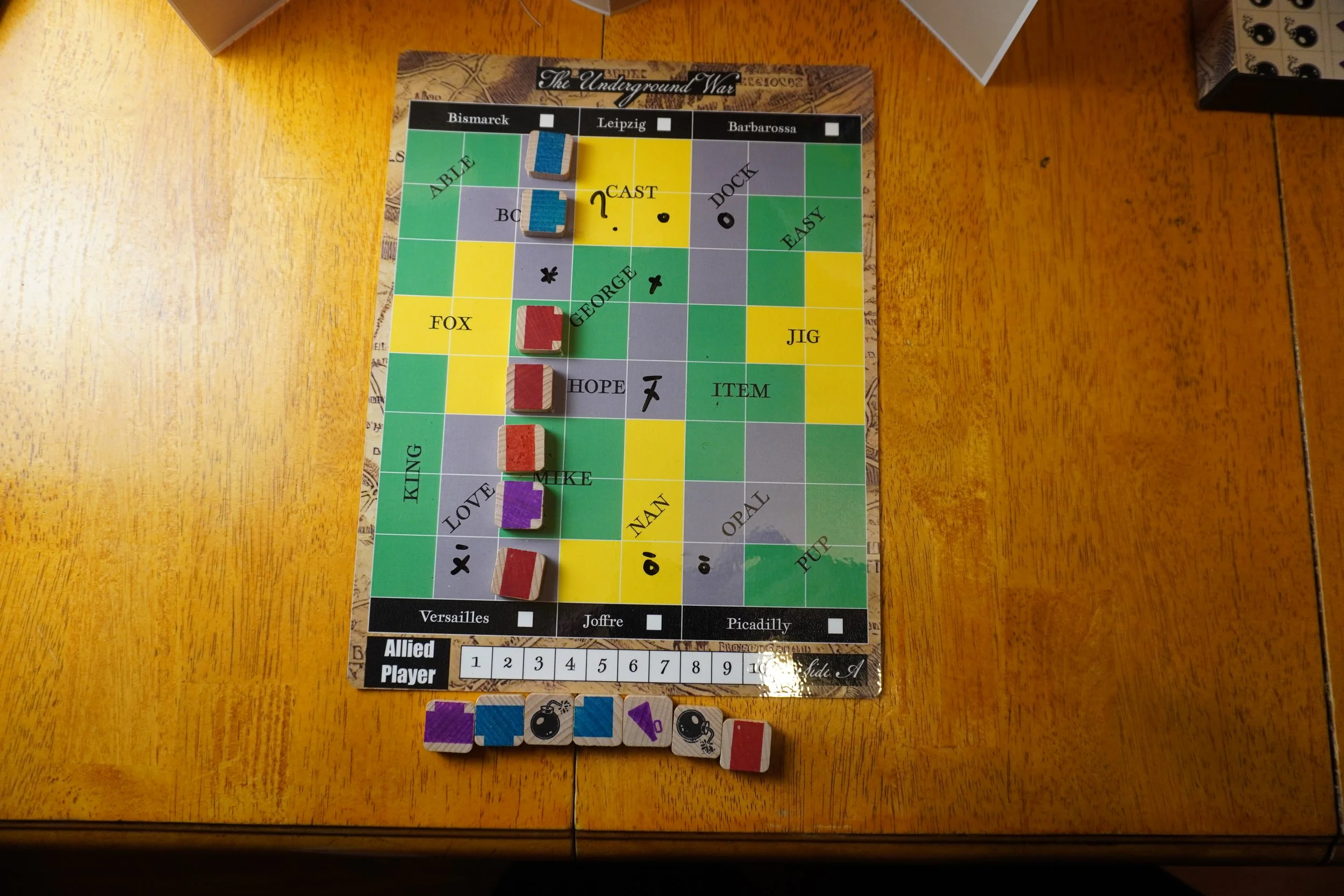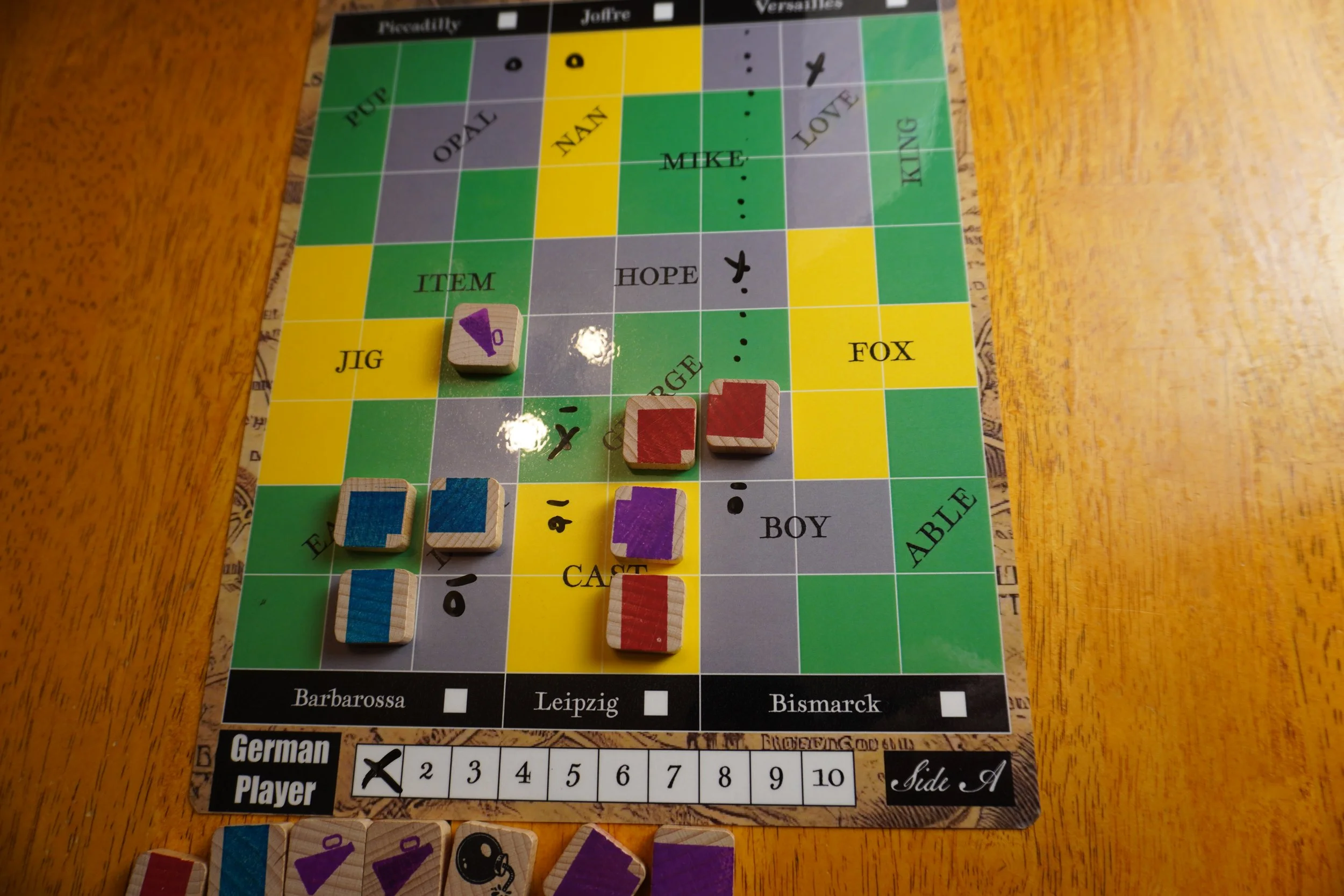 A simple but tense 20 minute tile laying duel. In this game players represent sappers during World War One as they tunnel their way to sap the enemy trenches and destroy their tunnels before they do the same to you. Each player has own board but they are the same board representing the same section of earth beneath no-man’s-land; the rulebook is propped up to create a screen so that player’s cannot see each other’s board or tiles. players will listen for the enemy tunnels, dig, and detonate their way to victory by deducing enemy locations and making good use of available munitions. Can you sap the enemy Trenches before they sap yours?